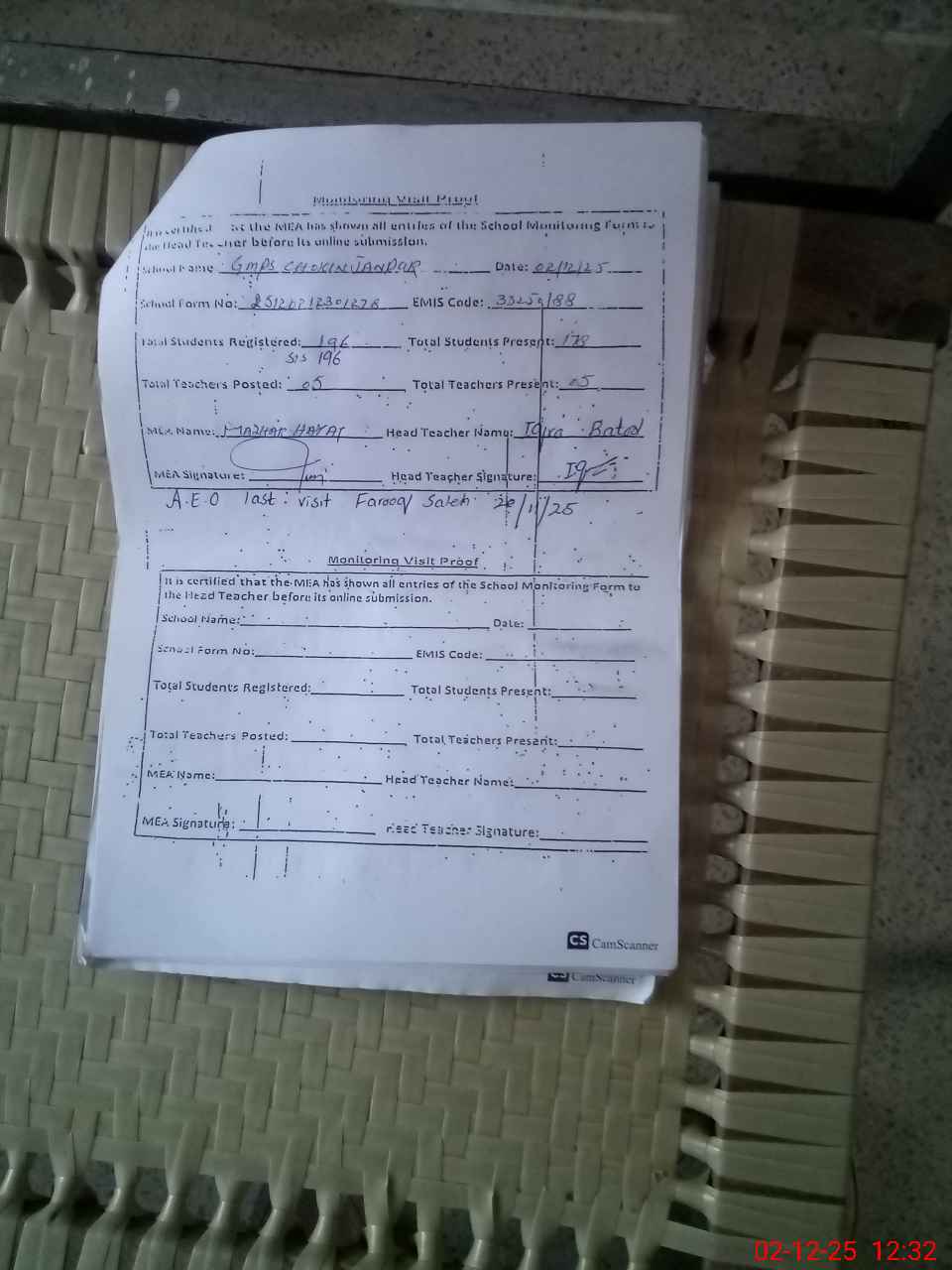 | Attendance Register | Head Teacher | MEA with School | Visit Proof |