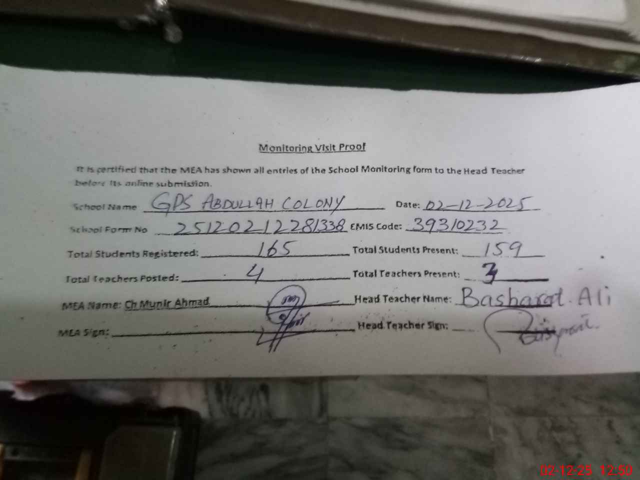 | Attendance Register | Head Teacher | MEA with School | Visit Proof |