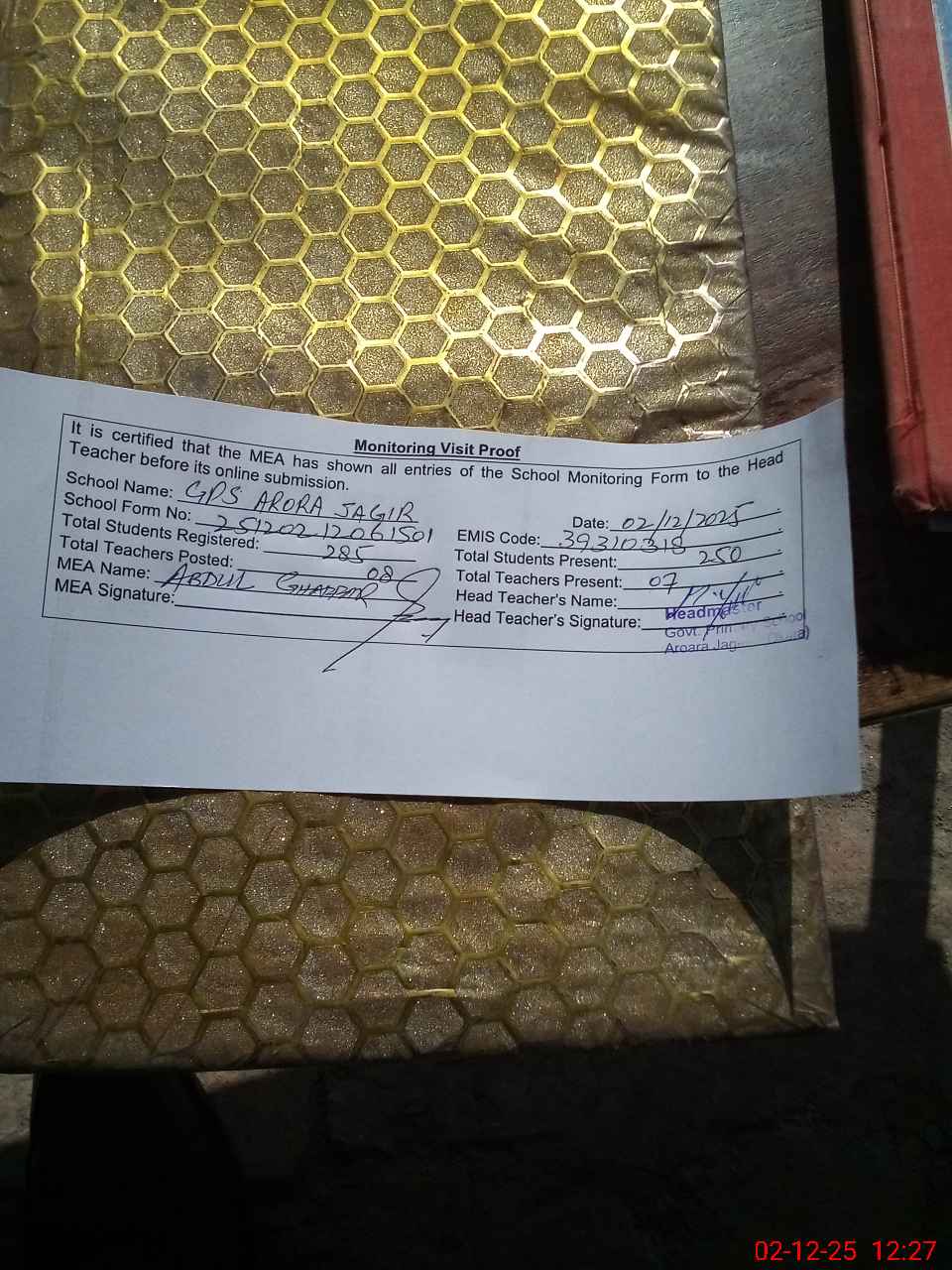 | Attendance Register | Head Teacher | MEA with School | Visit Proof |