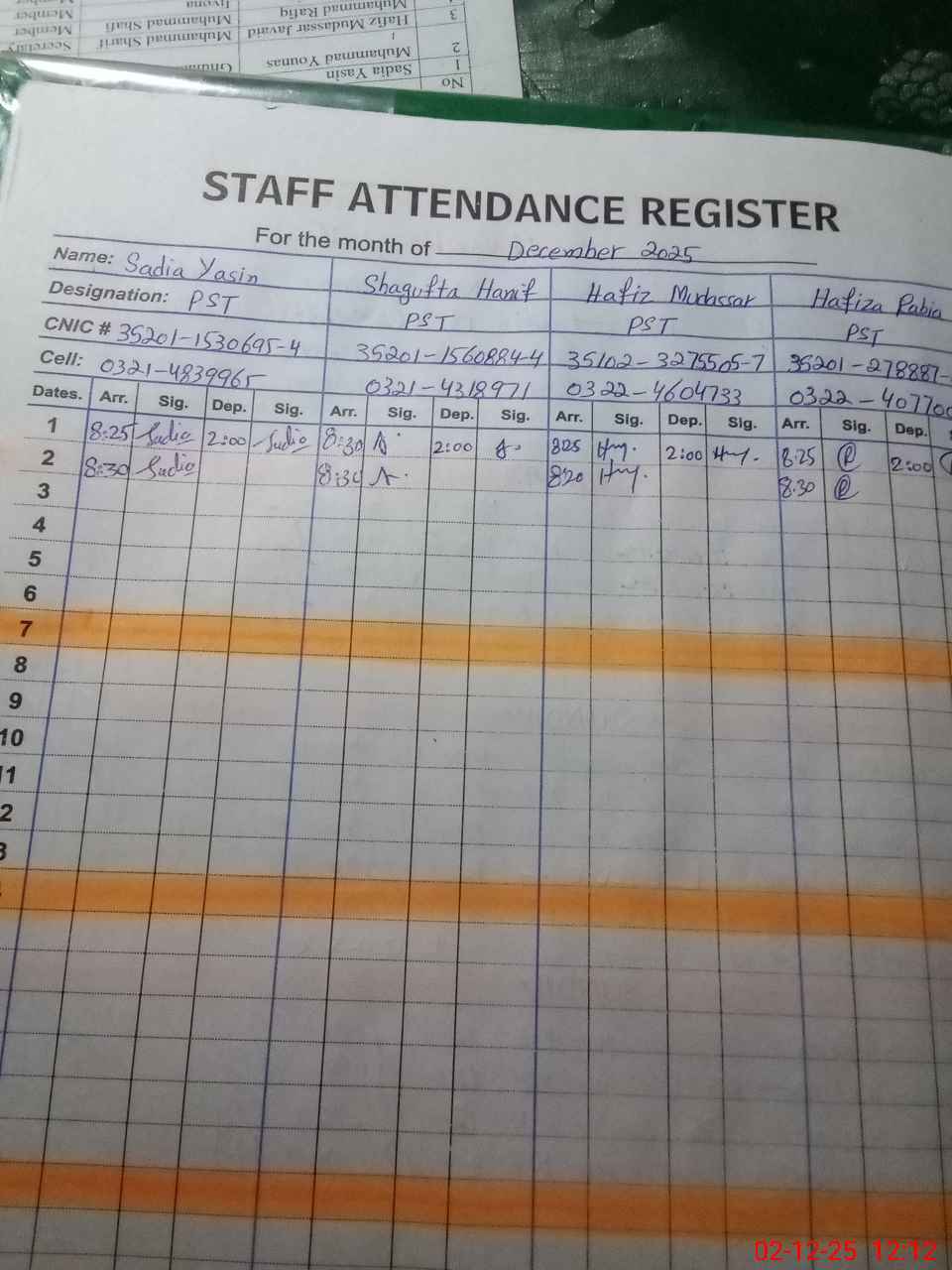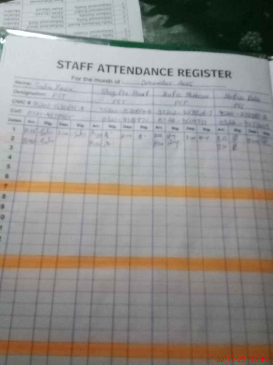 | CNIC | Full Name | Designation | R/C | Absence During Last Calender Month |