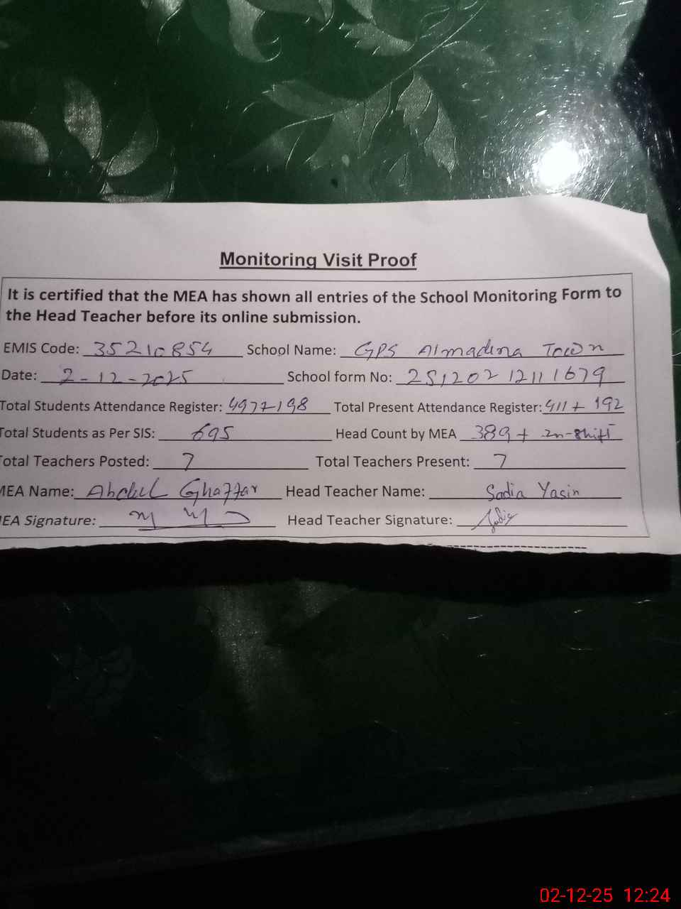 | Attendance Register | Head Teacher | MEA with School | Visit Proof |