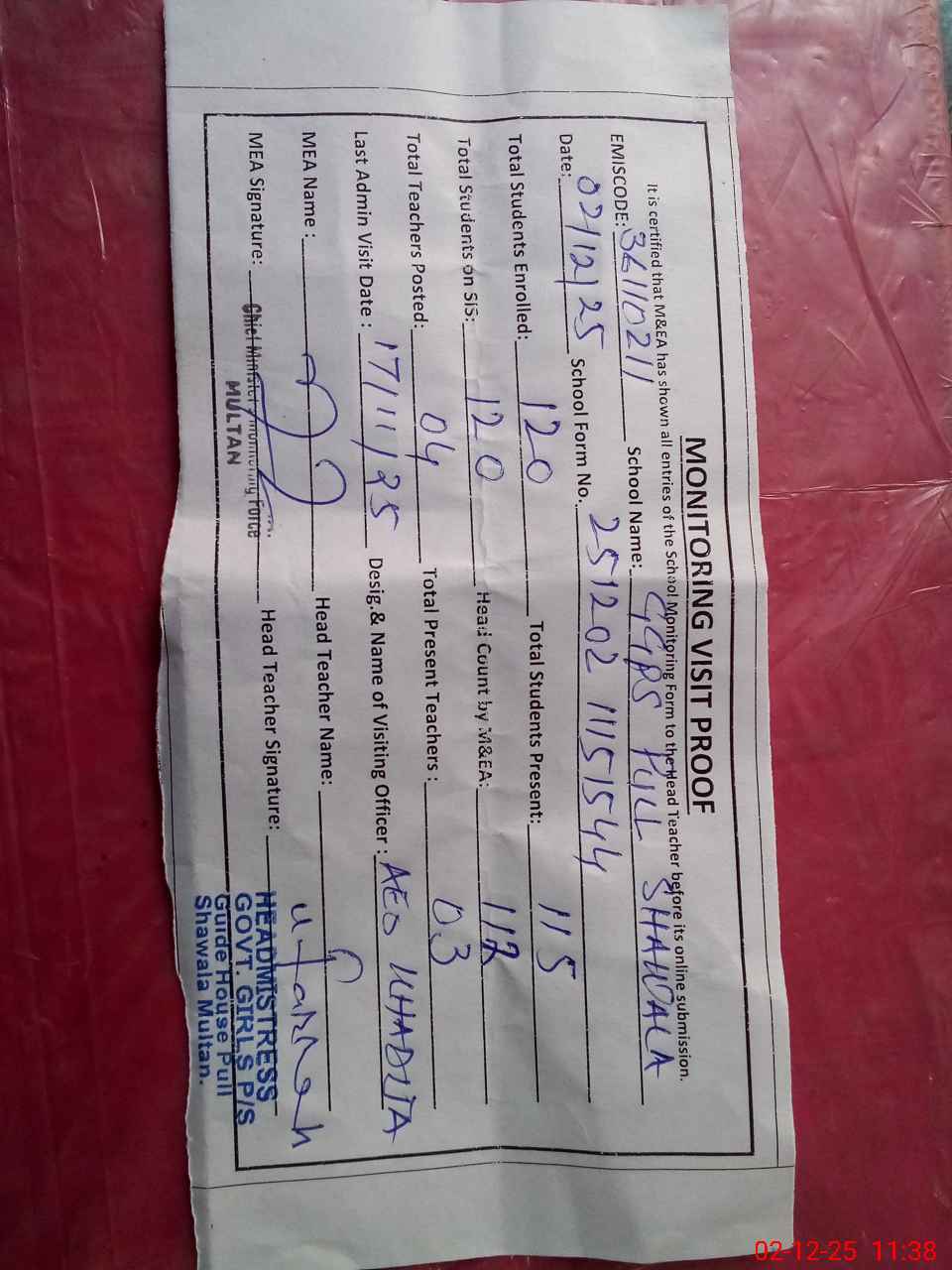 | EMIS Code: 36110211 | Name of School: GGPS PULL SHAWALA MULTAN | |||