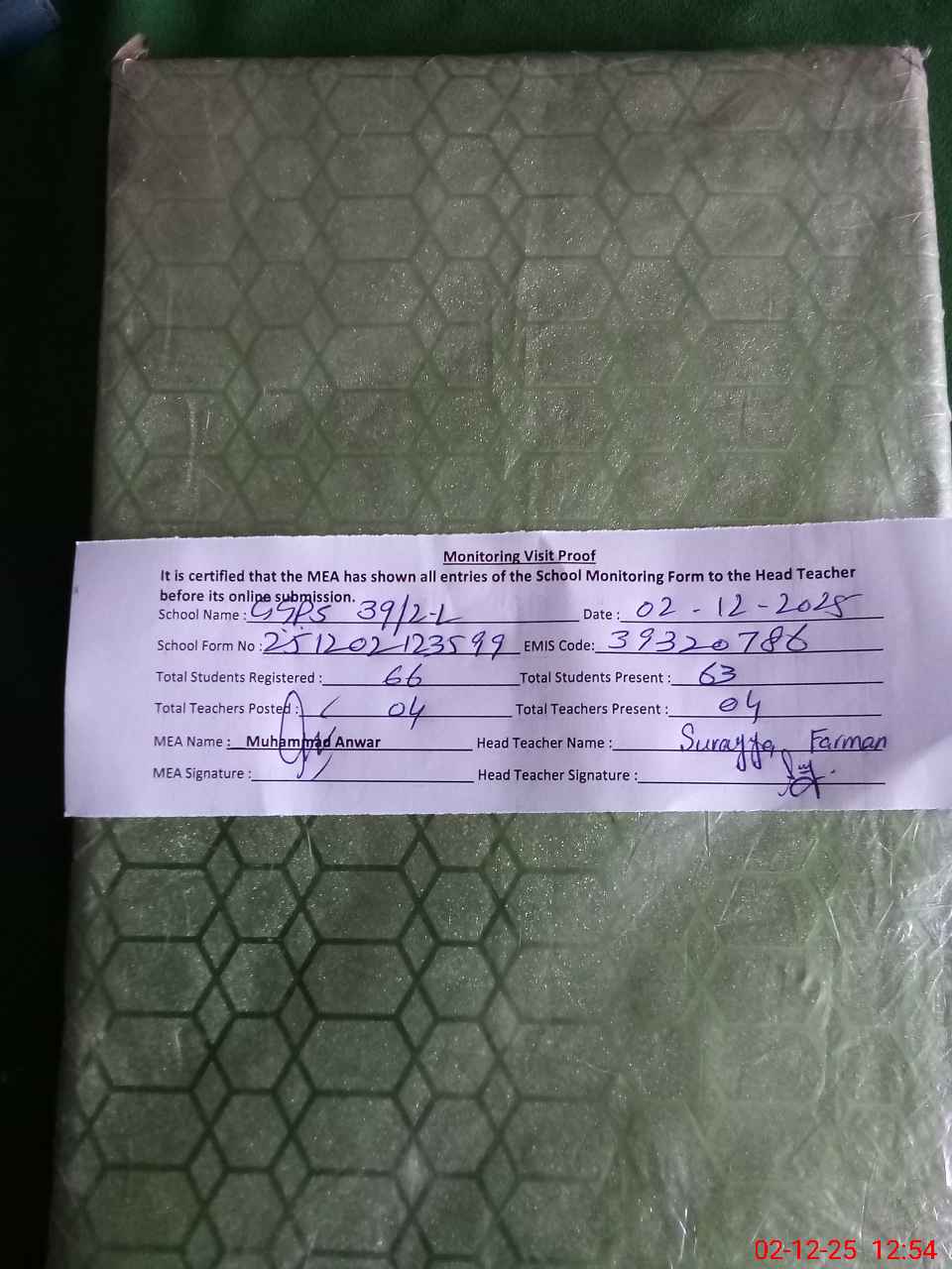 | Attendance Register | Head Teacher | MEA with School | Visit Proof |
