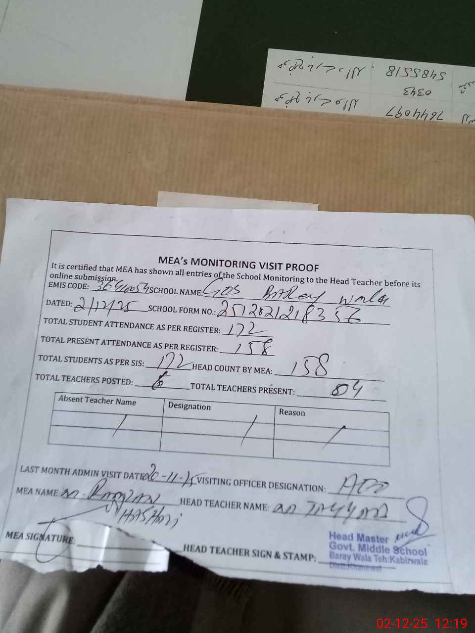 | Attendance Register | Head Teacher | MEA with School | Visit Proof |