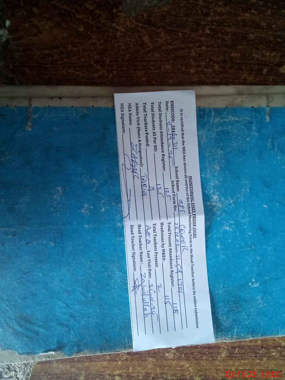 | Attendance Register | Head Teacher | MEA with School | Visit Proof |