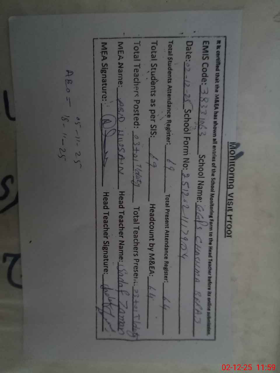 | EMIS Code: 38331063 | Name of School: GGPS CHASHMA BERAJ | |||