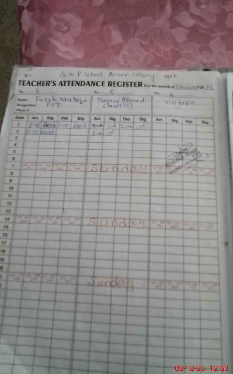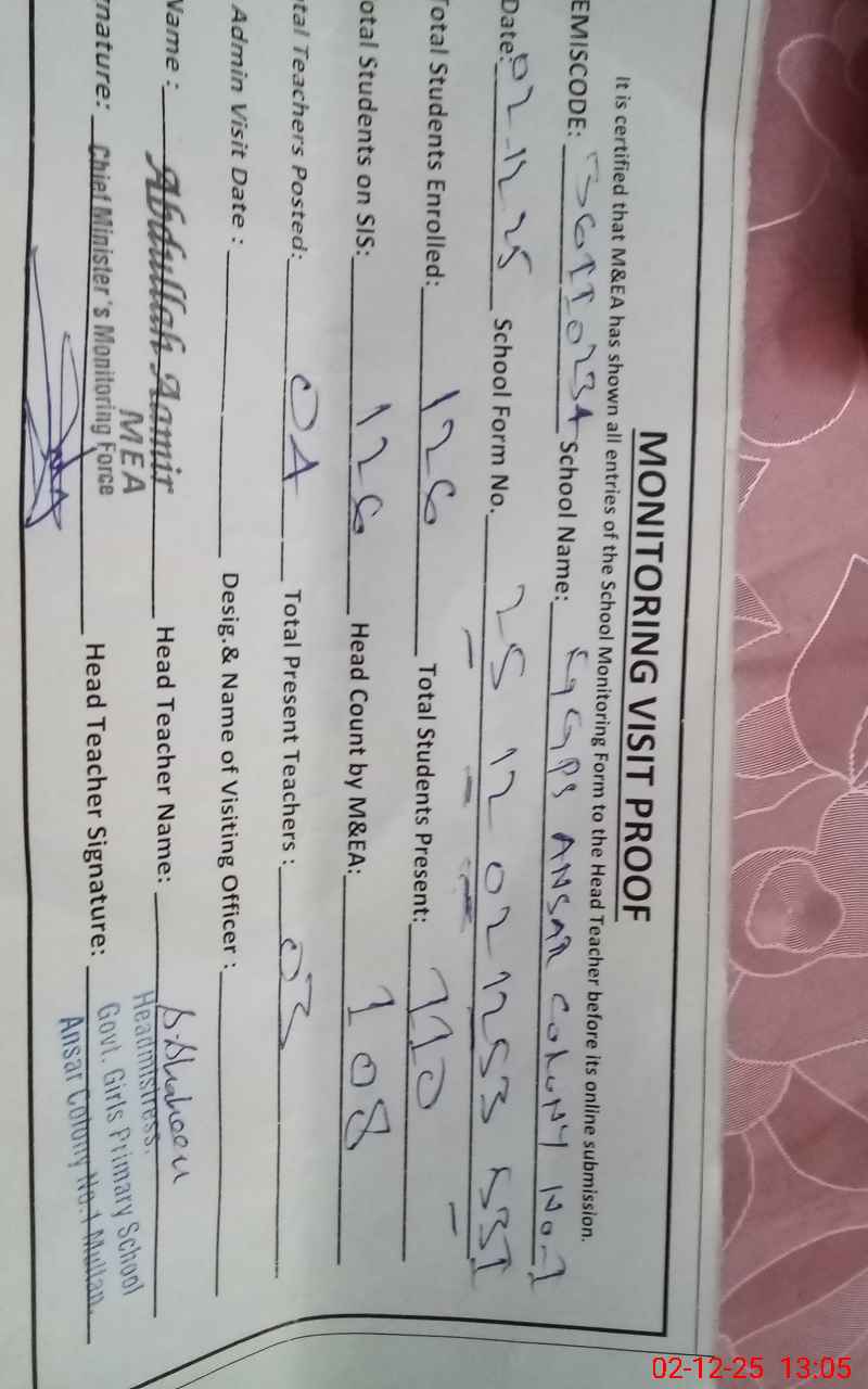 | EMIS Code: 36110234 | Name of School: GGPS ANSAR COLONY NO.1 MULTAN | |||