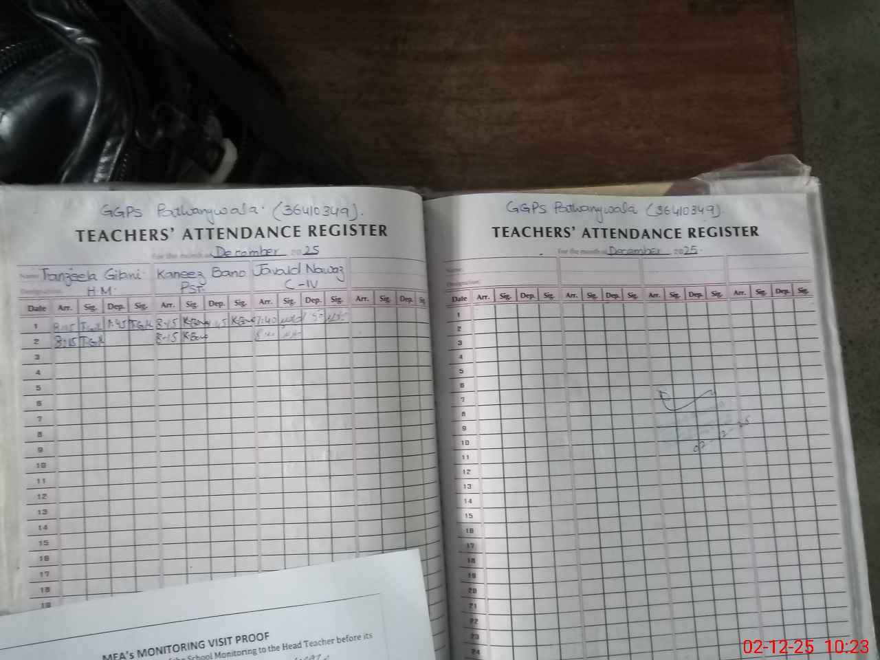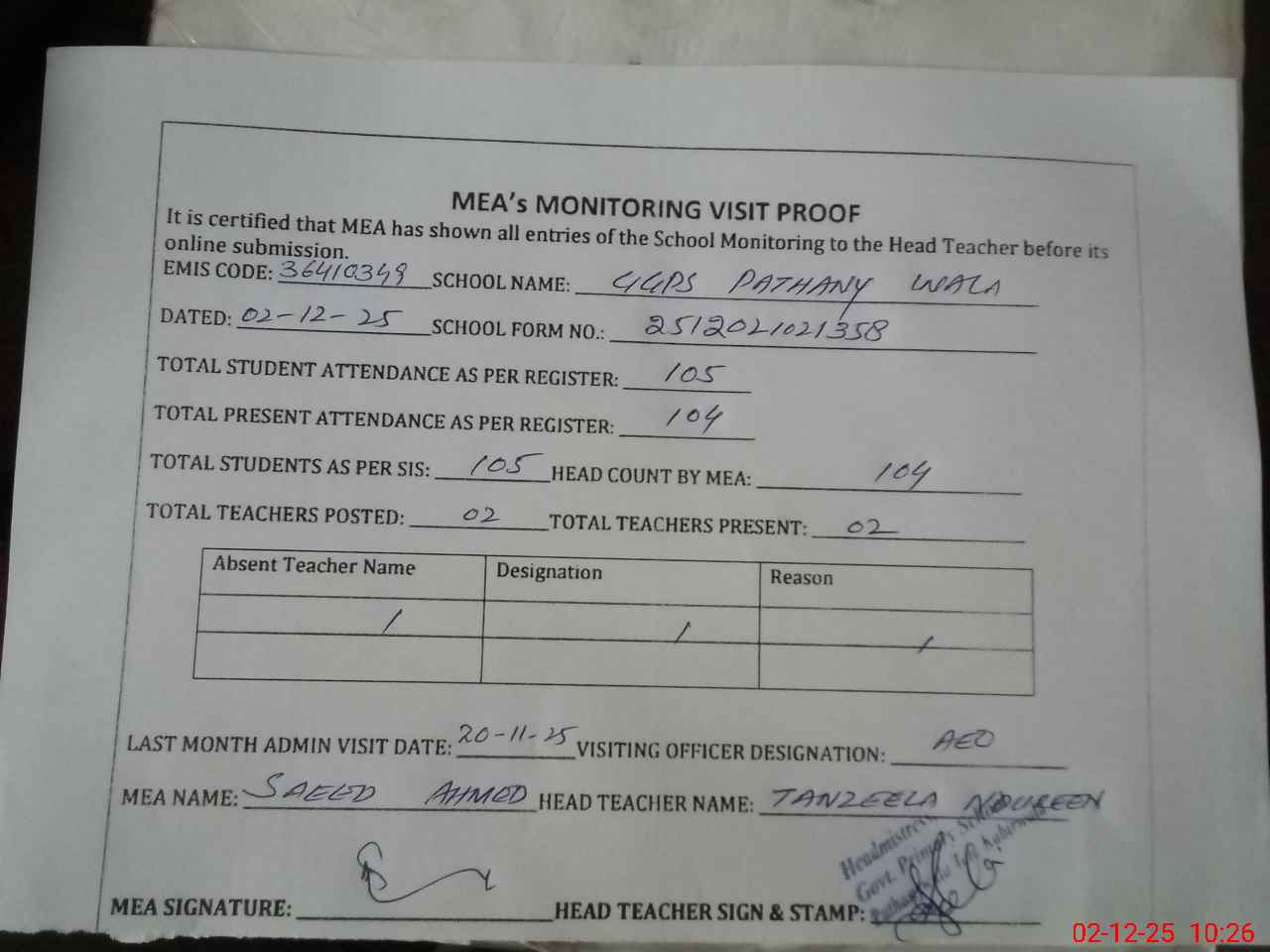 | Attendance Register | Head Teacher | MEA with School | Visit Proof |