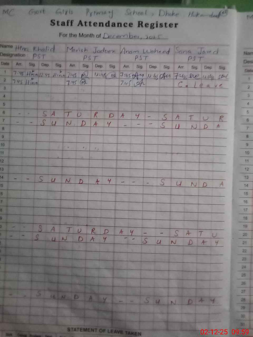 | CNIC | Full Name | Designation | R/C | Absence During Last Calender Month |