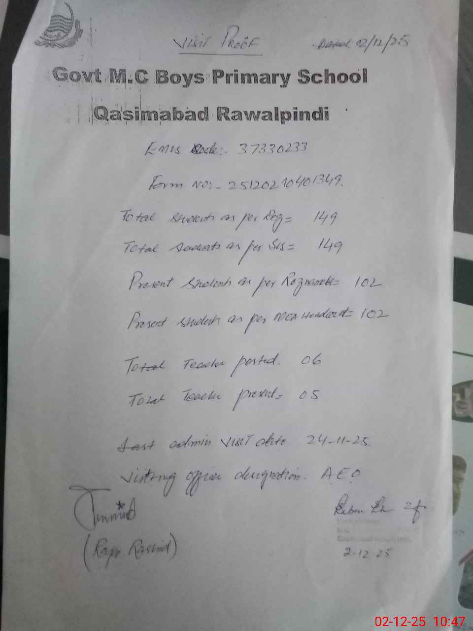 | EMIS Code: 37330233 | Name of School: GPS MC QASIMABAD STREET NO. 6 RWP | |||