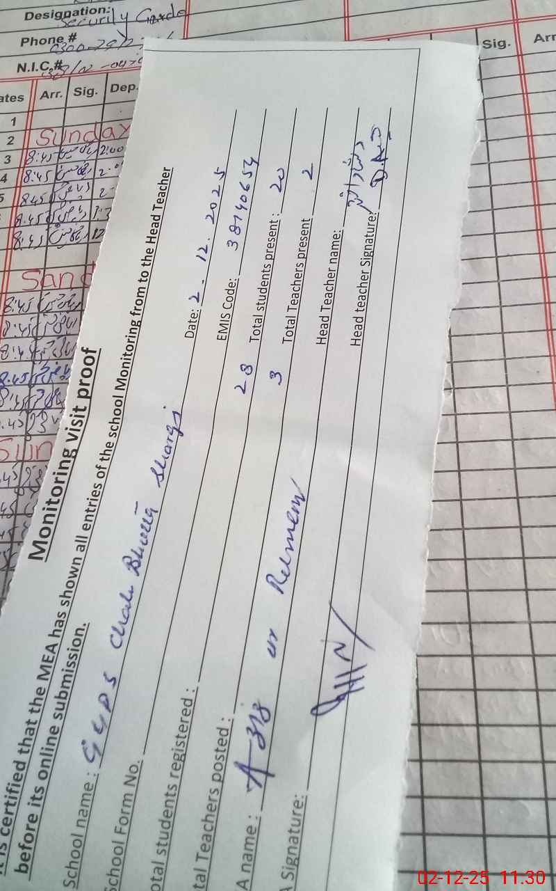 | Attendance Register | Head Teacher | MEA with School | Visit Proof |