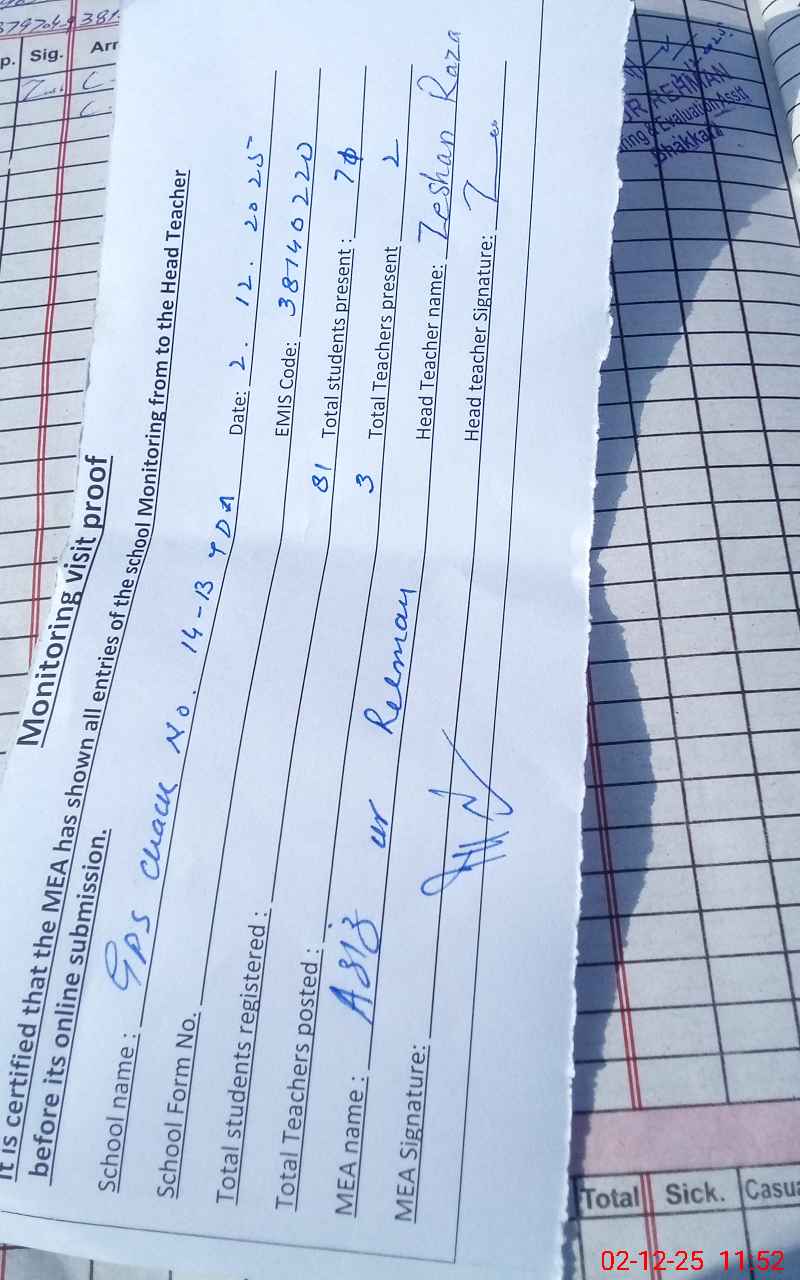 | Attendance Register | Head Teacher | MEA with School | Visit Proof |
