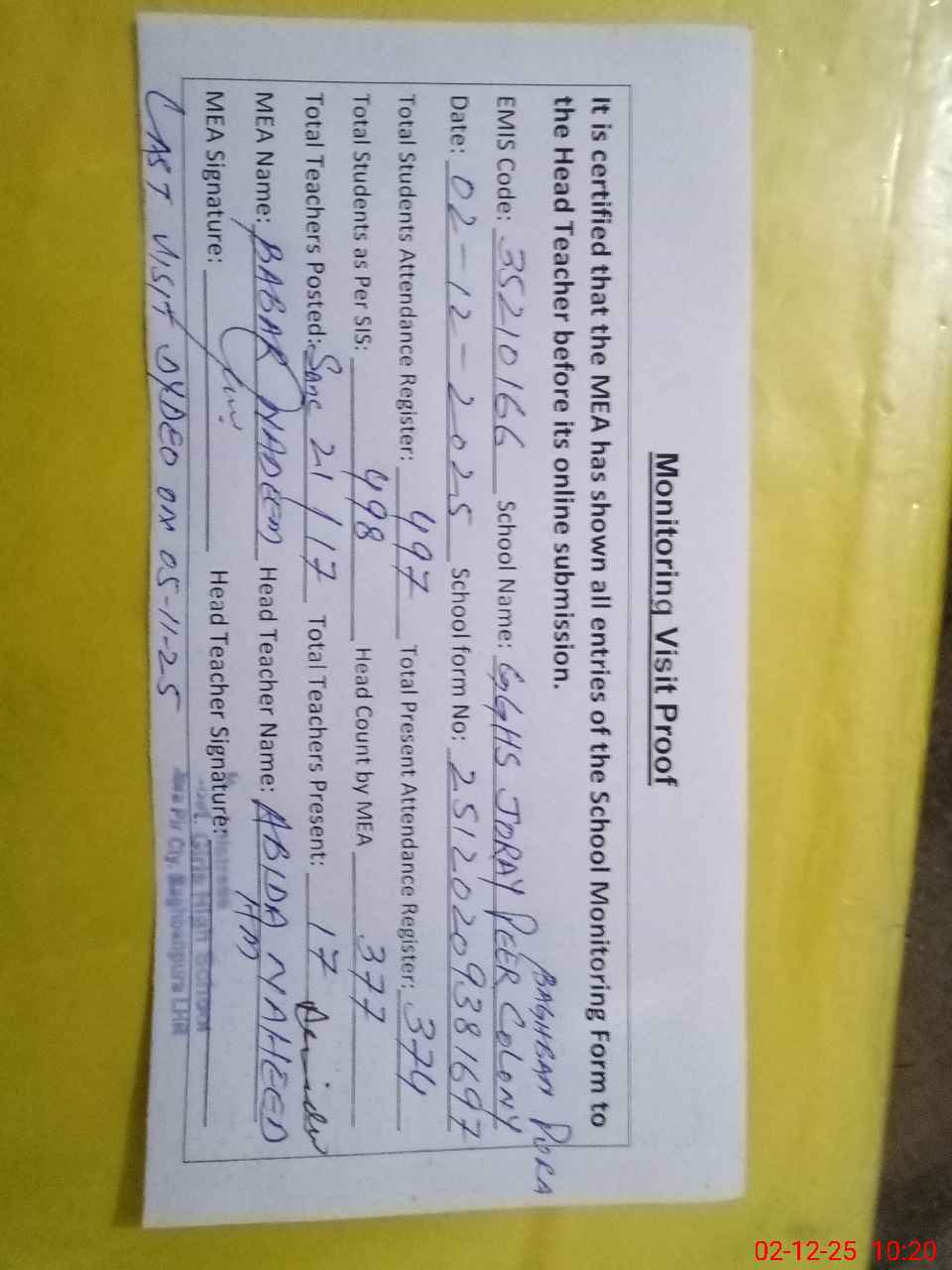 | Attendance Register | Head Teacher | MEA with School | Visit Proof |
