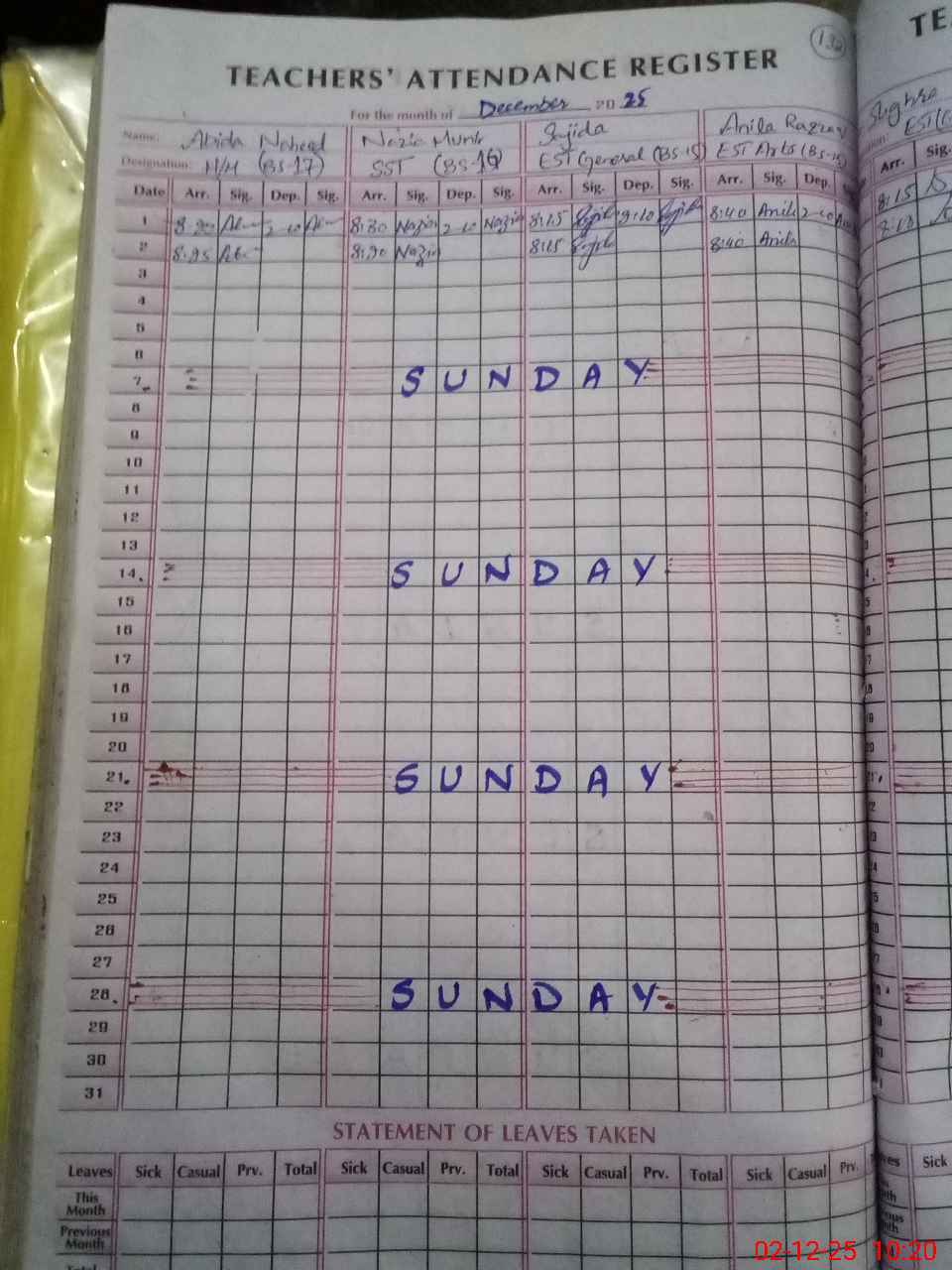 | CNIC | Full Name | Designation | R/C | Absence During Last Calender Month |