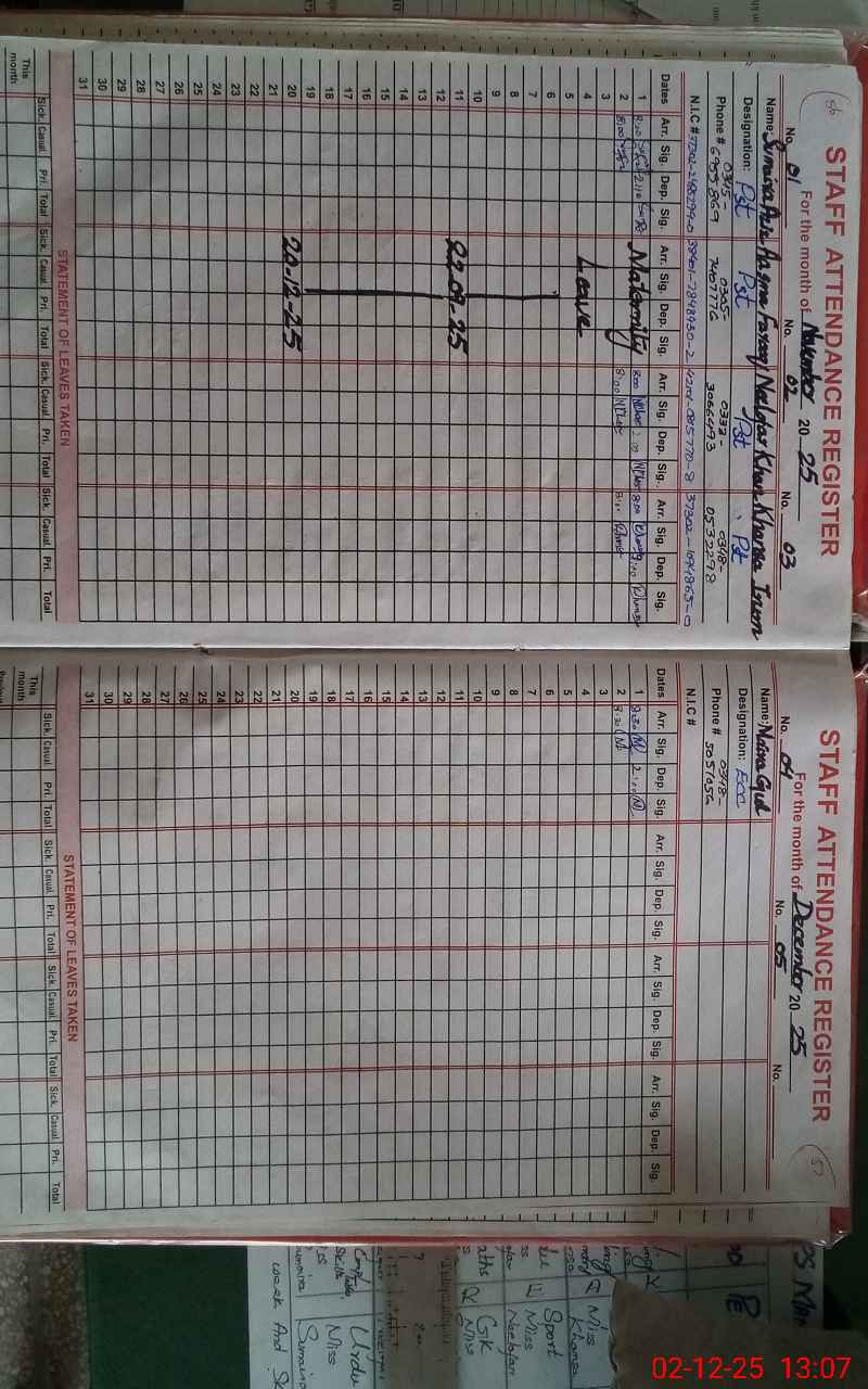 | CNIC | Full Name | Designation | R/C | Absence During Last Calender Month |