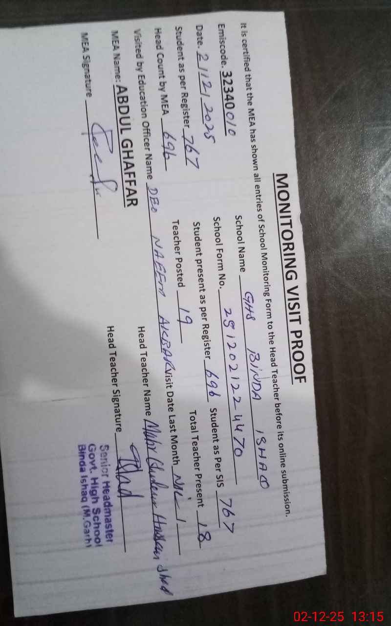 | EMIS Code: 32340010 | Name of School: GHS BINDA ISHAQ | |||