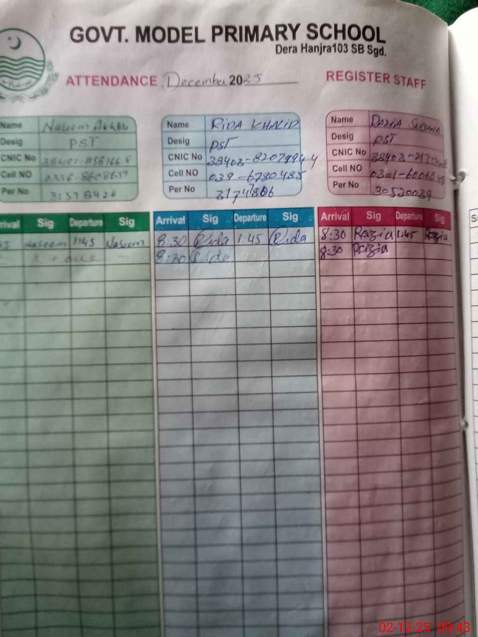 | CNIC | Full Name | Designation | R/C | Absence during last cal. month |
