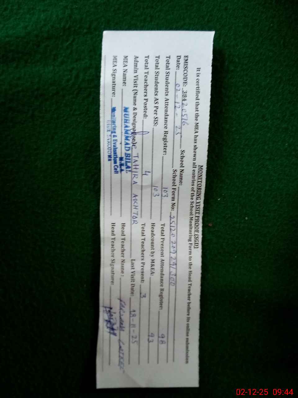 | Attendance Register | Head Teacher | MEA with School | Visit Proof |