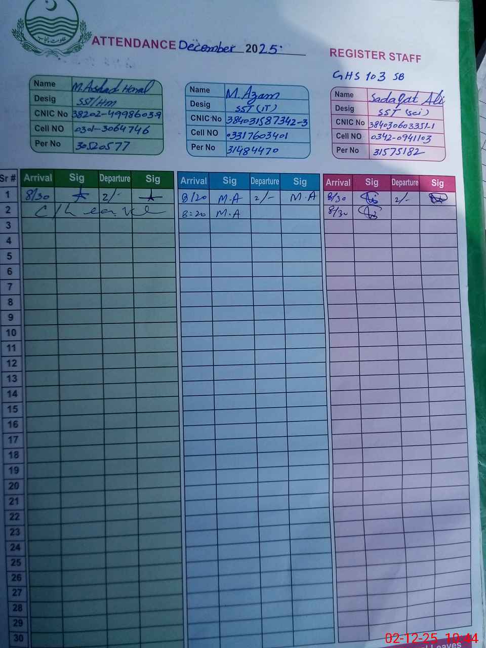 | CNIC | Full Name | Designation | R/C | Absence during last cal. month |