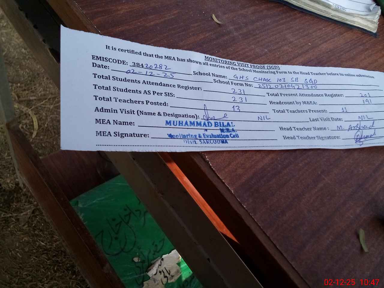 | EMIS Code: 38420282 | Name of School: GHS CHAK NO.103 SB | |||