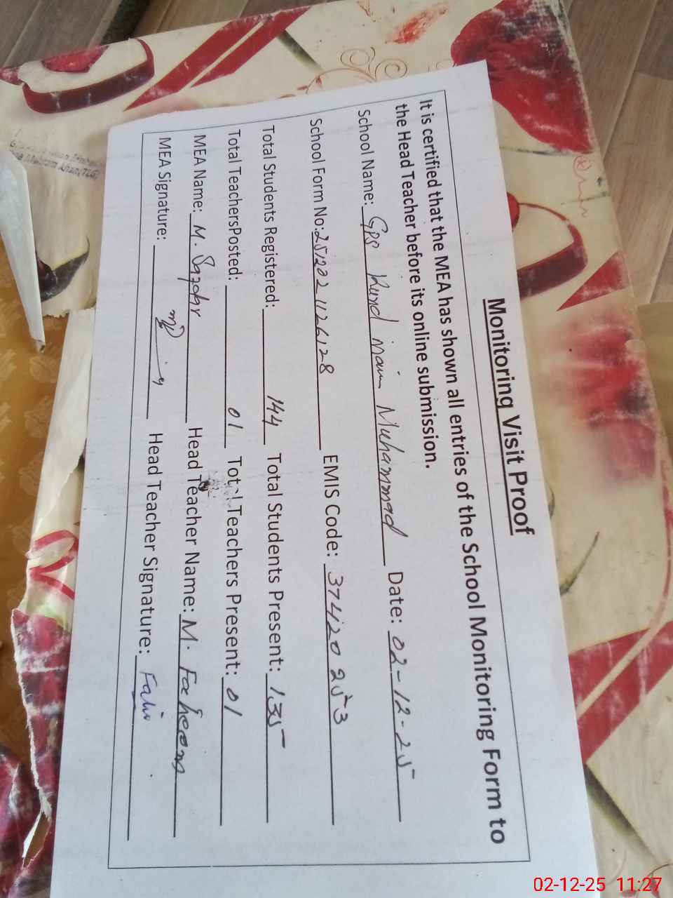 | Attendance Register | Head Teacher | MEA with School | Visit Proof |