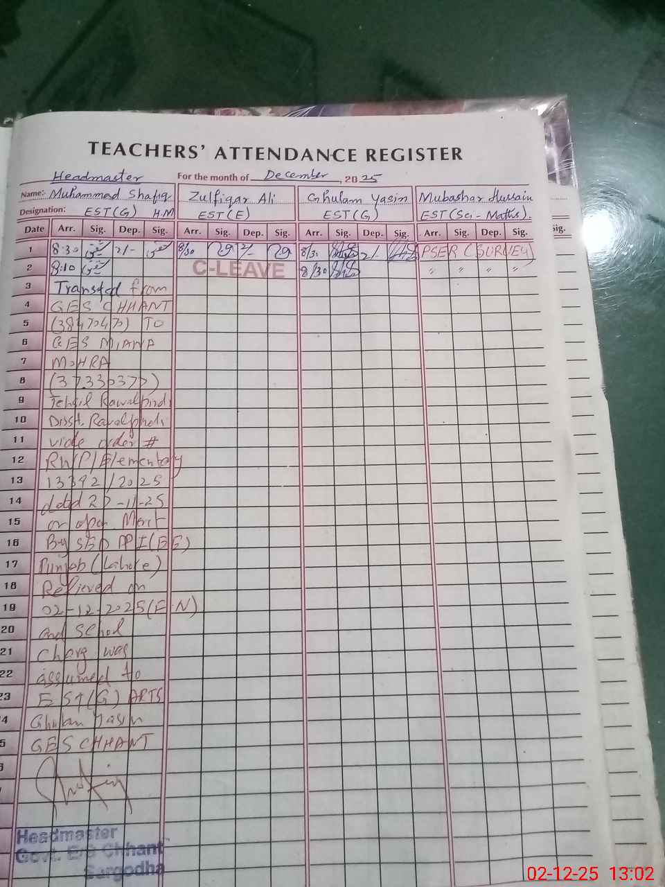 | CNIC | Full Name | Designation | R/C | Absence During Last Calender Month |