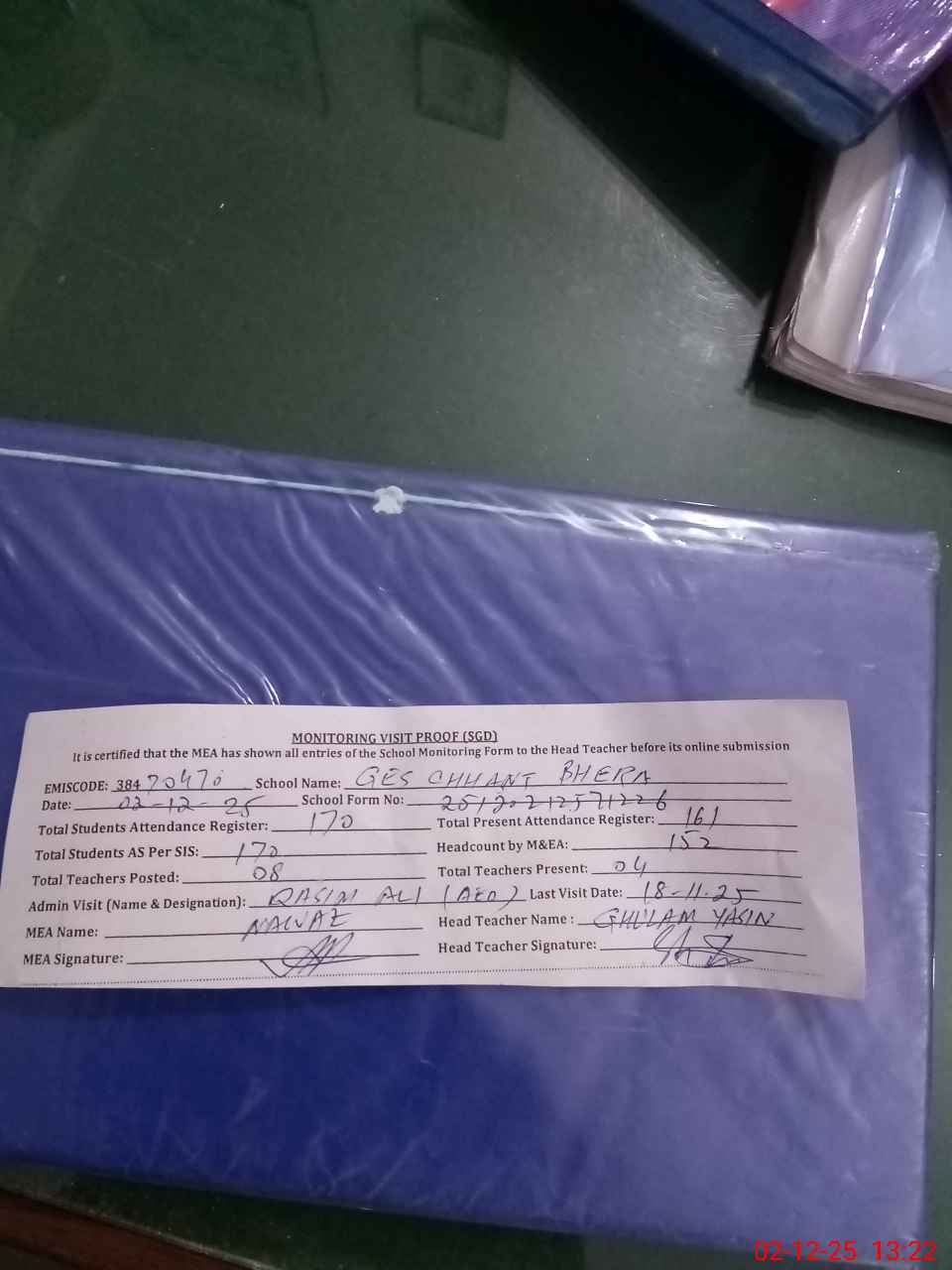 | Attendance Register | Head Teacher | MEA with School | Visit Proof |