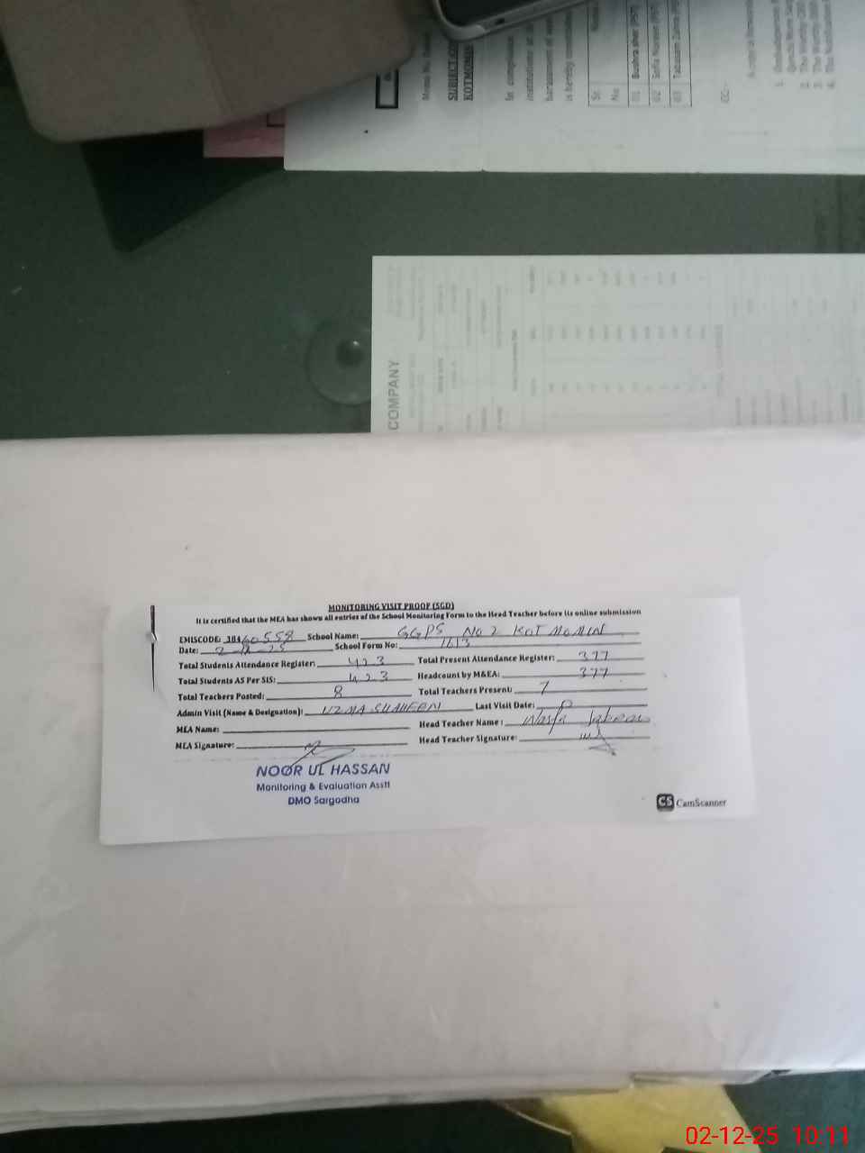 | Attendance Register | Head Teacher | MEA with School | Visit Proof |