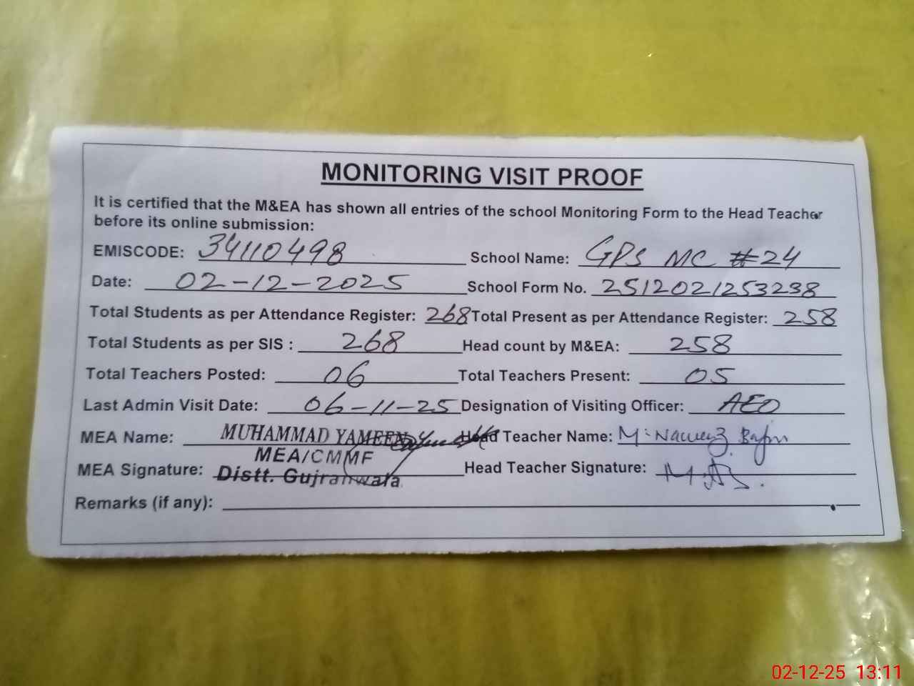| Attendance Register | Head Teacher | MEA with School | Visit Proof |