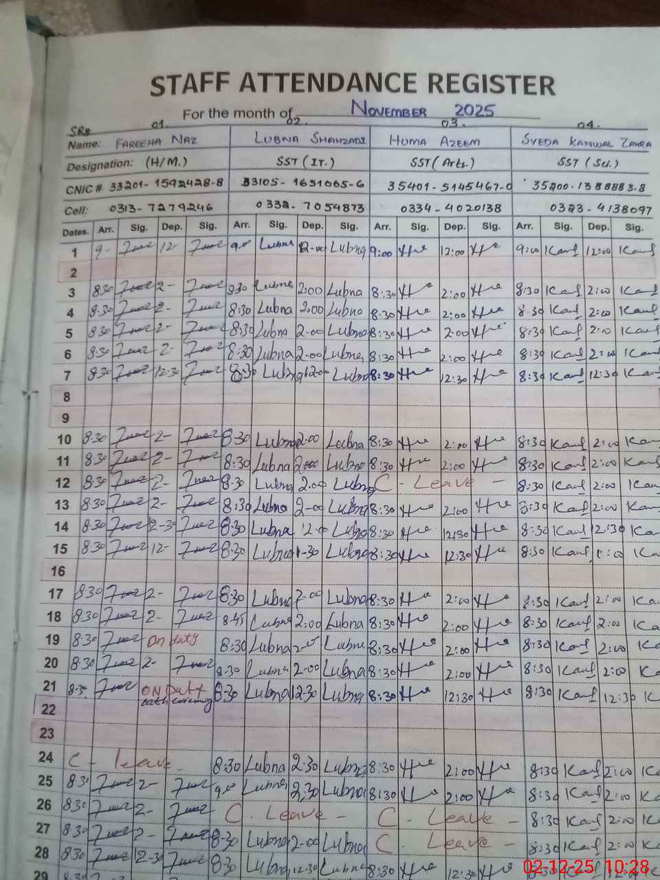 | CNIC | Full Name | Designation | R/C | Absence during last cal. month |