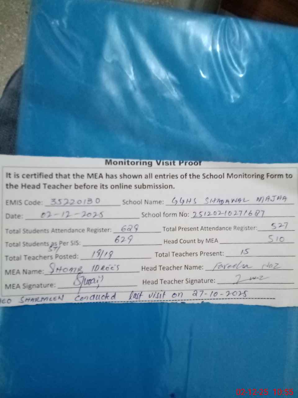 | Attendance Register | Head Teacher | MEA with School | Visit Proof |