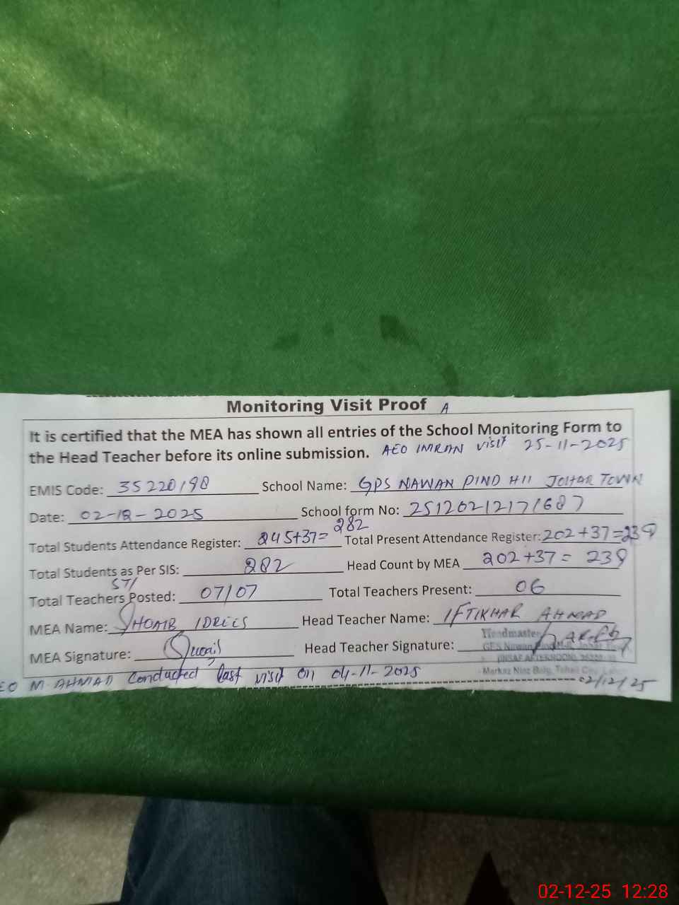| EMIS Code: 35220198 | Name of School: GPS NAWAN PIND H-II JOHAR TOWN TEHSIL CITY | |||