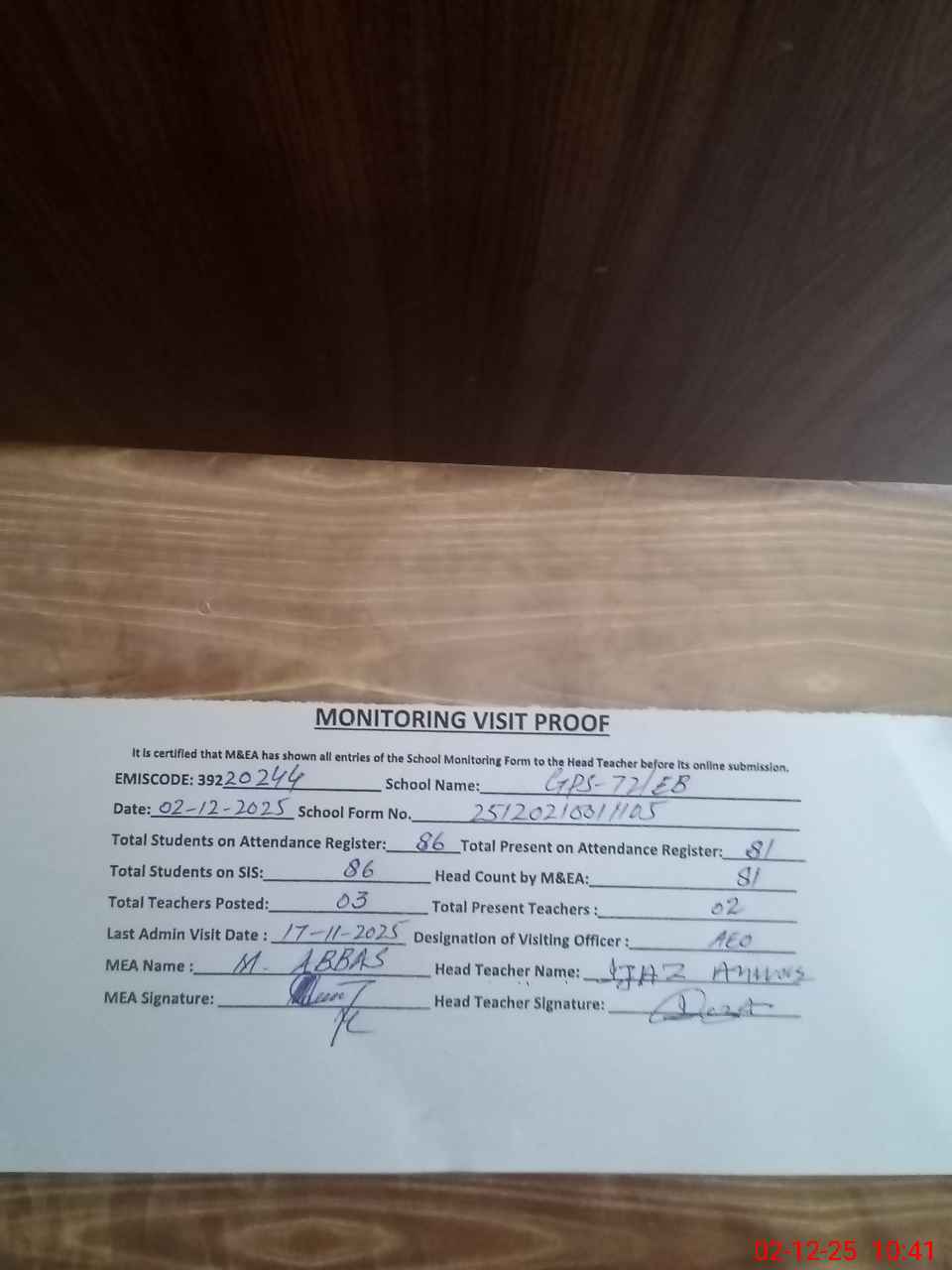 | Attendance Register | Head Teacher | MEA with School | Visit Proof |