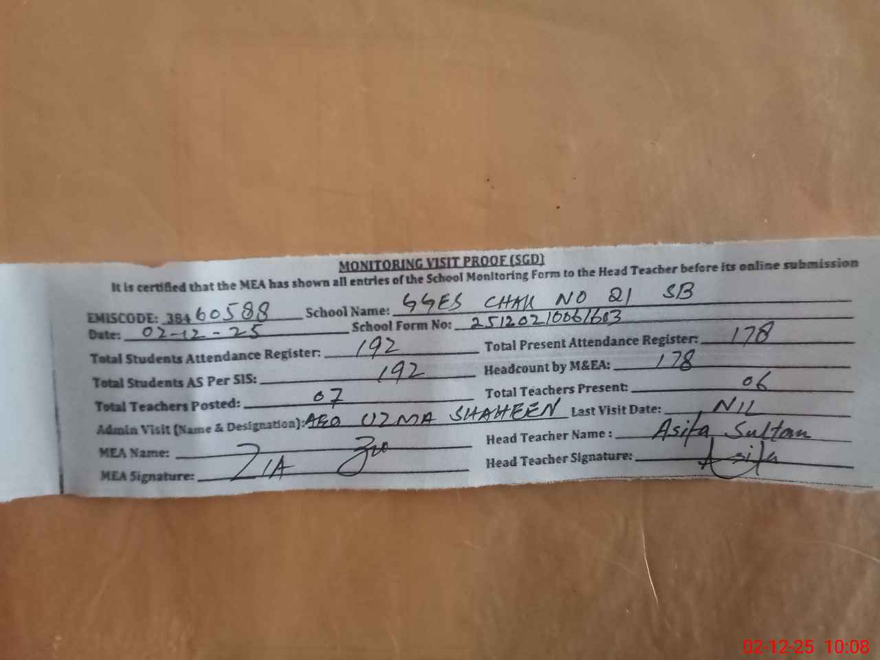 | Attendance Register | Head Teacher | MEA with School | Visit Proof |