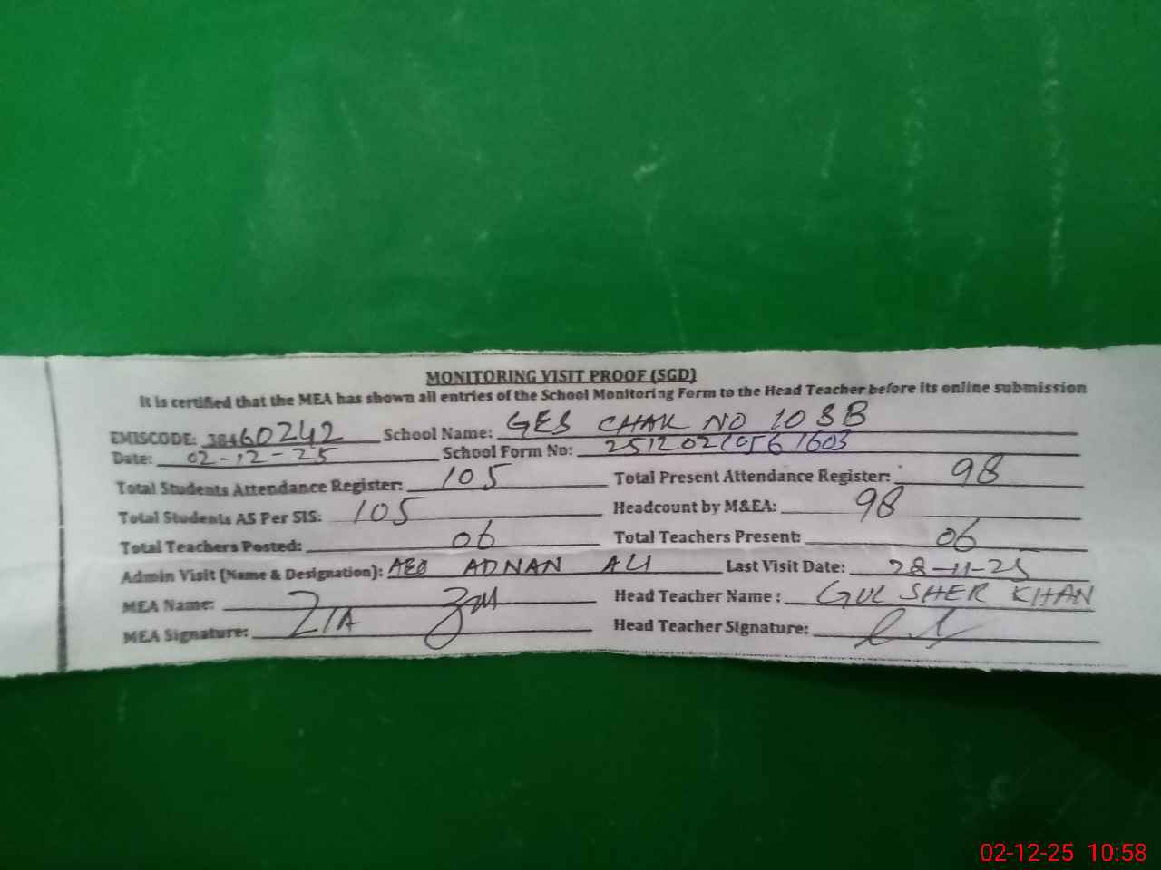 | Attendance Register | Head Teacher | MEA with School | Visit Proof |