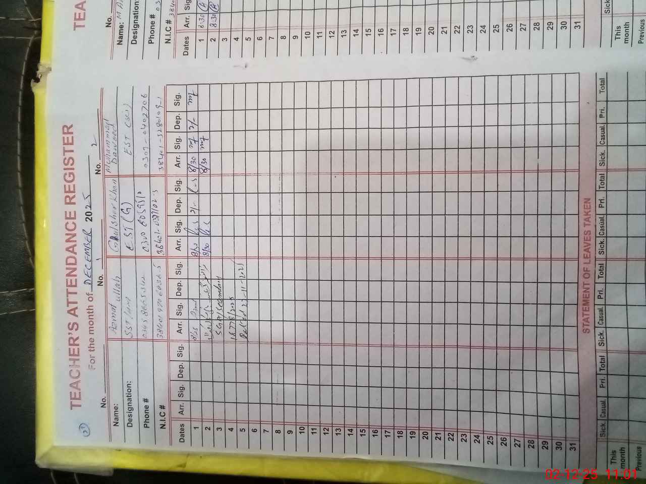 | CNIC | Full Name | Designation | R/C | Absence During Last Calender Month |