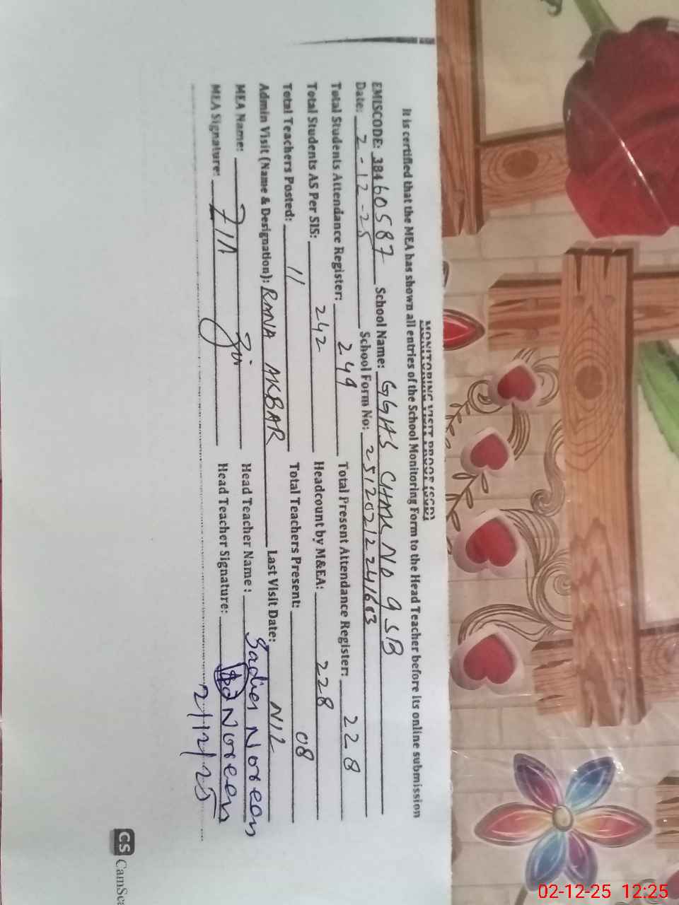 | Attendance Register | Head Teacher | MEA with School | Visit Proof |