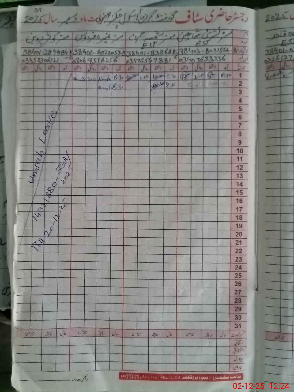 | CNIC | Full Name | Designation | R/C | Absence during last cal. month |