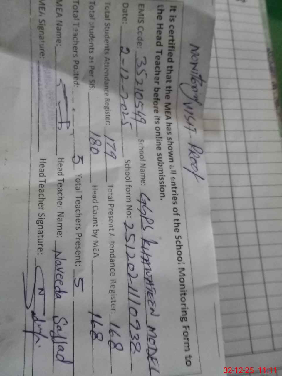 | Attendance Register | Head Teacher | MEA with School | Visit Proof |