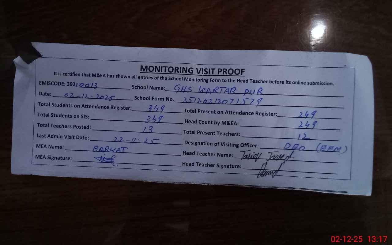 | EMIS Code: 39210013 | Name of School: GHS KARTAR PUR | |||