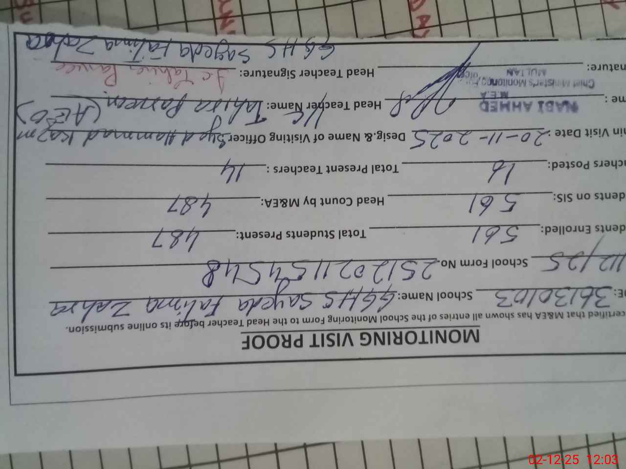 | Attendance Register | Head Teacher | MEA with School | Visit Proof |