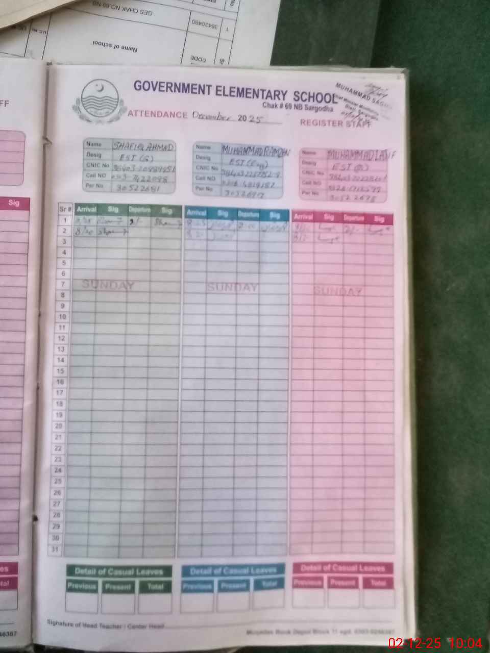 | CNIC | Full Name | Designation | R/C | Absence During Last Calender Month |