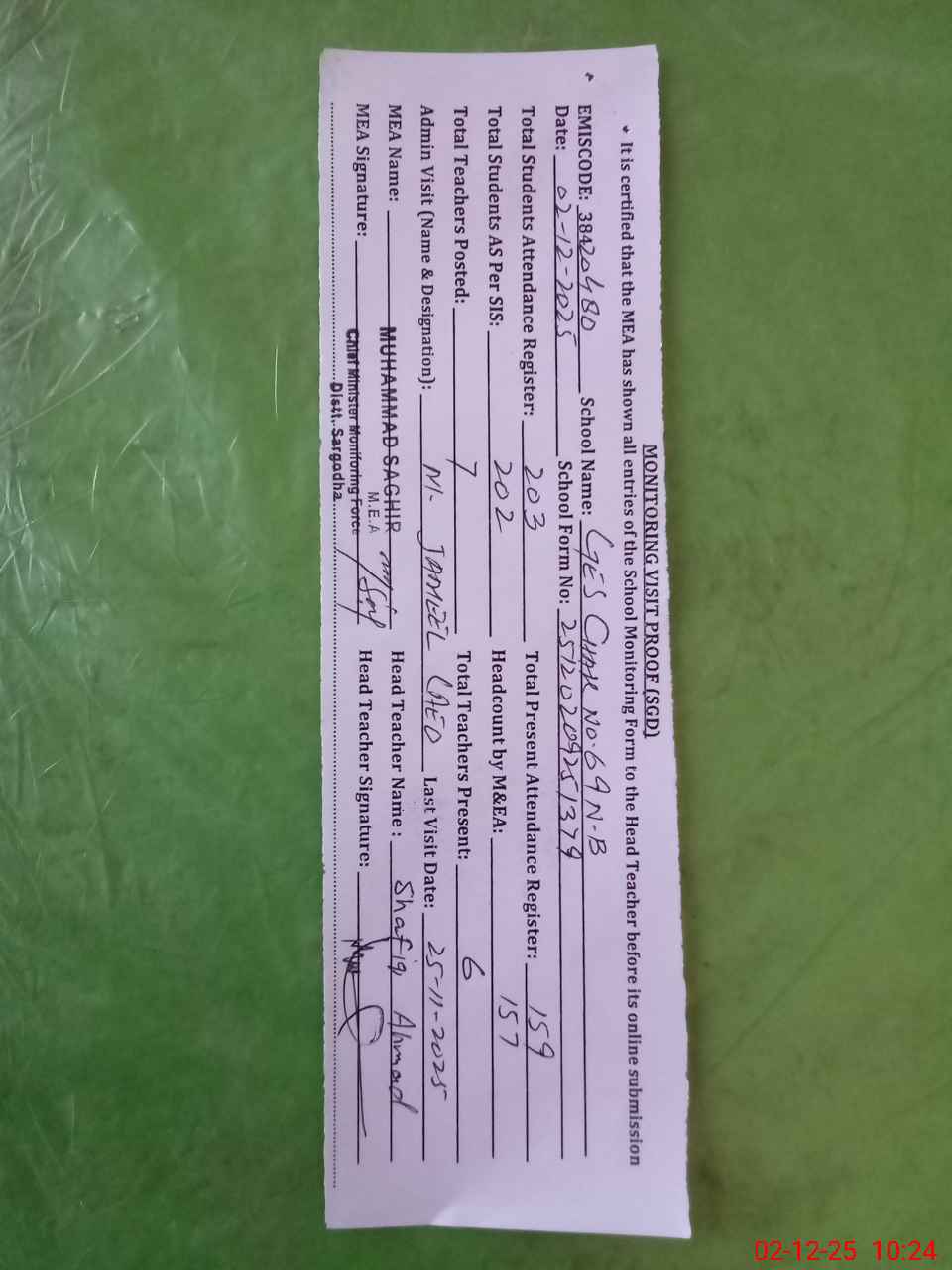 | Attendance Register | Head Teacher | MEA with School | Visit Proof |