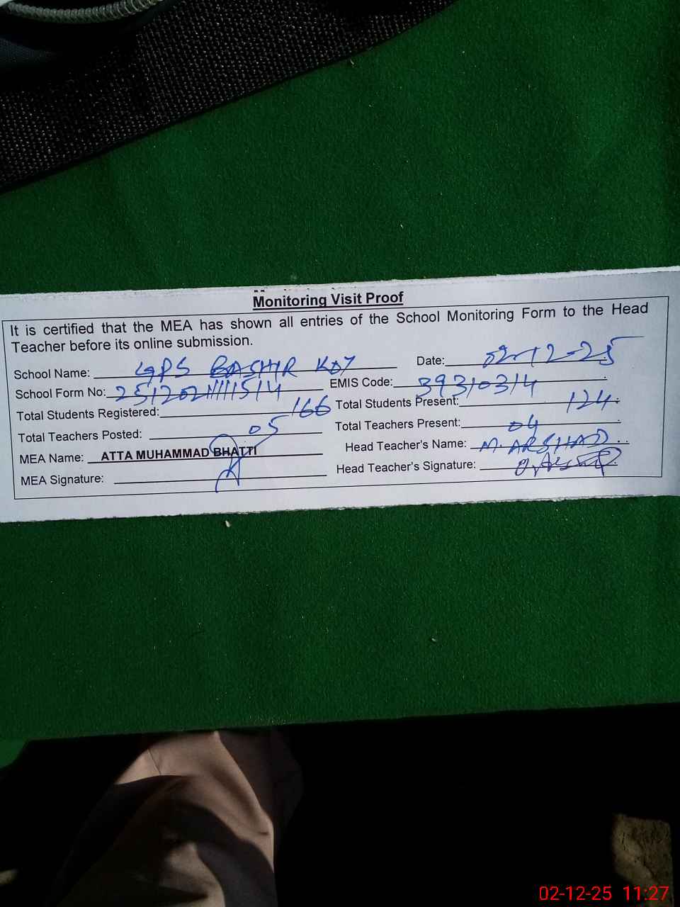 | Remarks (Use Separate Page if Required): Last admin visit by AEO on 02 December 2025 before MEA visit | |||||