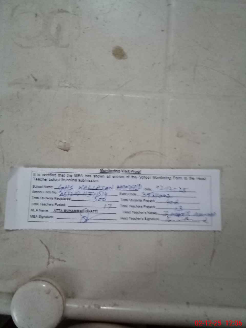 | Attendance Register | Head Teacher | MEA with School | Visit Proof |