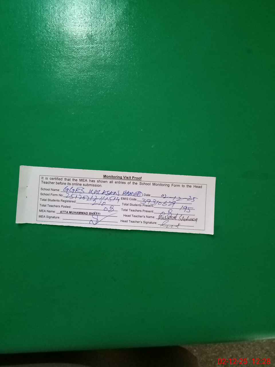 | Attendance Register | Head Teacher | MEA with School | Visit Proof |