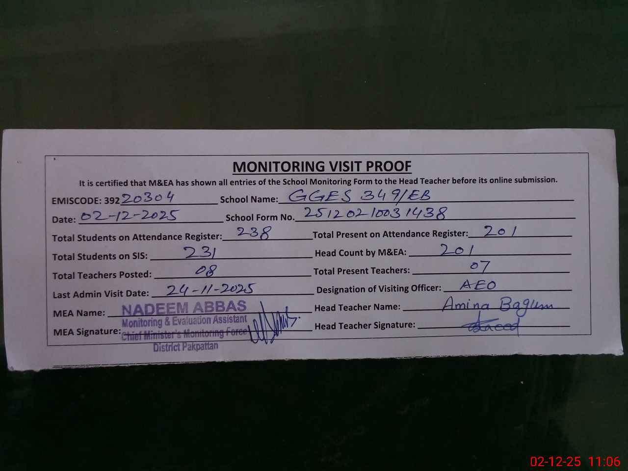 | EMIS Code: 39220304 | Name of School: GGES 349 EB POST OFFICE chak 157/EB | |||