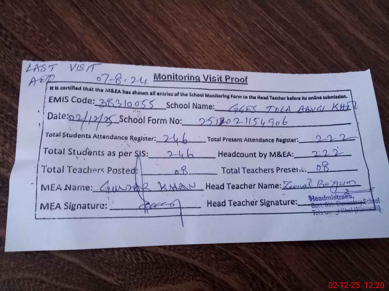 | Attendance Register | Head Teacher | MEA with School | Visit Proof |