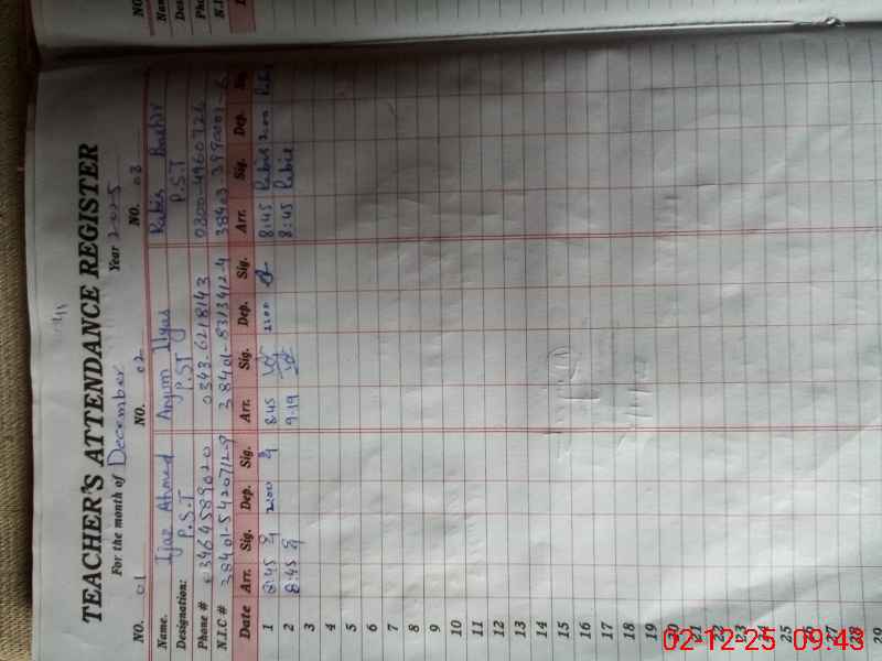 | Remarks (Use Separate Page if Required): During visit found 1- Teacher Anjum reached at school at 0919 where as Teacher timing at 0830 so SOP she marked as unauthorized | |||||
