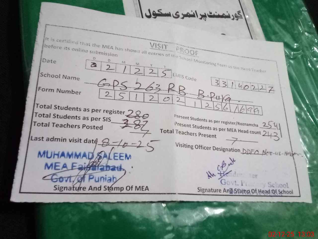 | Attendance Register | Head Teacher | MEA with School | Visit Proof |